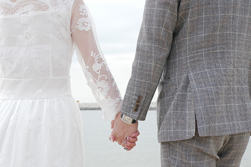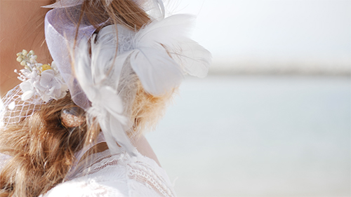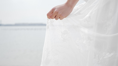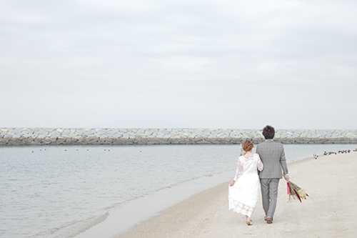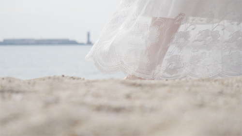 撮影場所のひとつは、ドレス姿が映えるよう海岸での撮影を提案させて頂きました。また、ご自宅・近所での愛犬との散歩などのシーンも取り込むことによって、普段の日常感が伝わるようにしました。