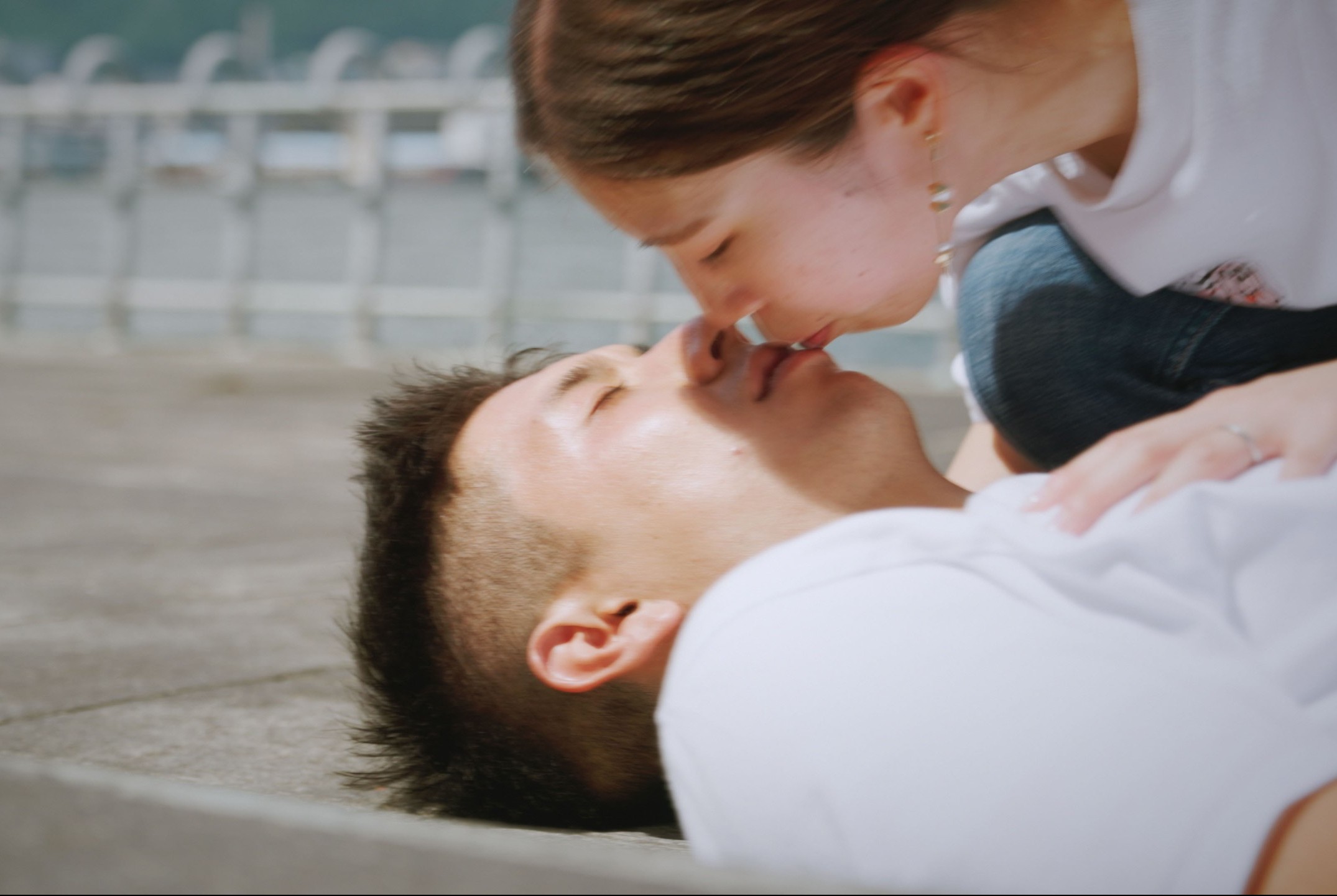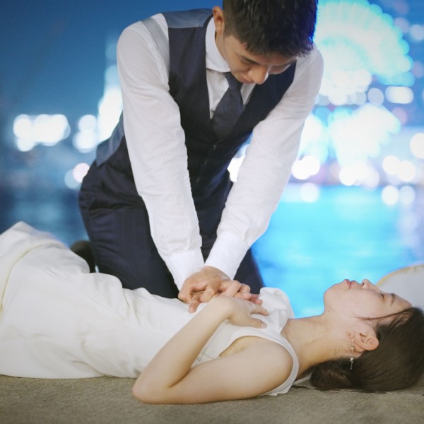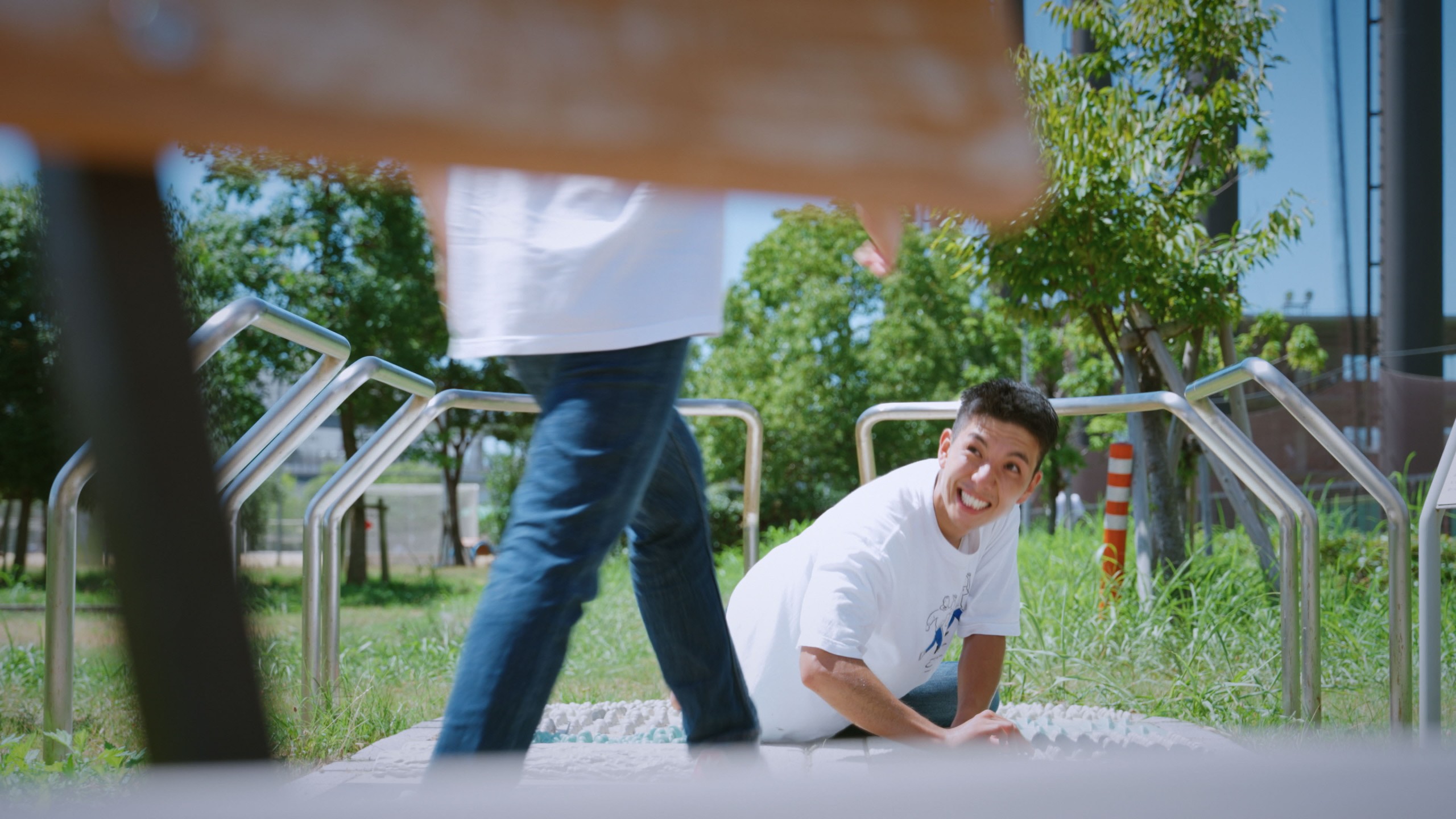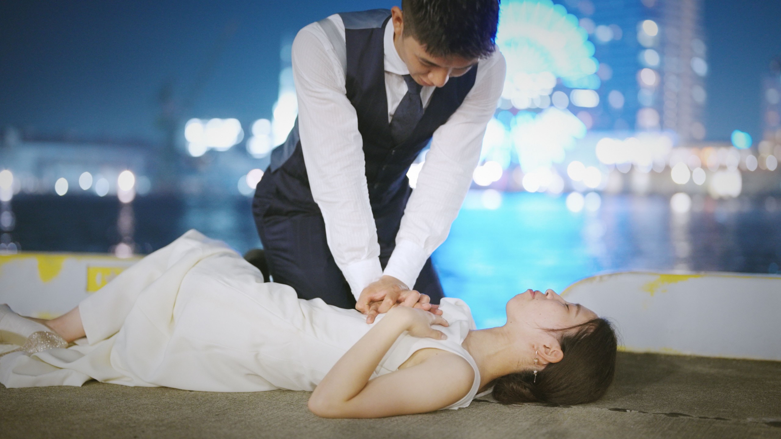 茶番感。おふたりのご要望テイスト。とにかくゲストの方に「何やってんのあんたら?しょーもないわー」と思ってもらいたい。披露宴入場前のオープニングムービーで流して、ゲストの温度感を高めたい。そんな想いをヒアリングの際にお聞きしました。「人を救護する」ことが仕事の一つであったおふたり。また、披露宴で以前に流行ったインドのあるダンスを踊りたかったけど、著作権の関係でできなかった、と。そこで提案したのが今回の構成。お互いに救護する→元気になる→テンション上がってインドダンスを踊る→ラストは超しょーもなく…。なかなか思い切った構成に振り切れたのは、おふたりの人柄があって、それを温かく見守ってくれるだろうゲストの方がいらっしゃったからだと思います。当然、当日の上映では大好評だったようで、おふたりにもご満足して頂けました。私もここまで振り切った構成をするのはなかなかないので、とても良い経験になりました。ちなみに、冒頭の告白シーンの場所は、実際にご新郎様がご新婦様に告白した公園です。