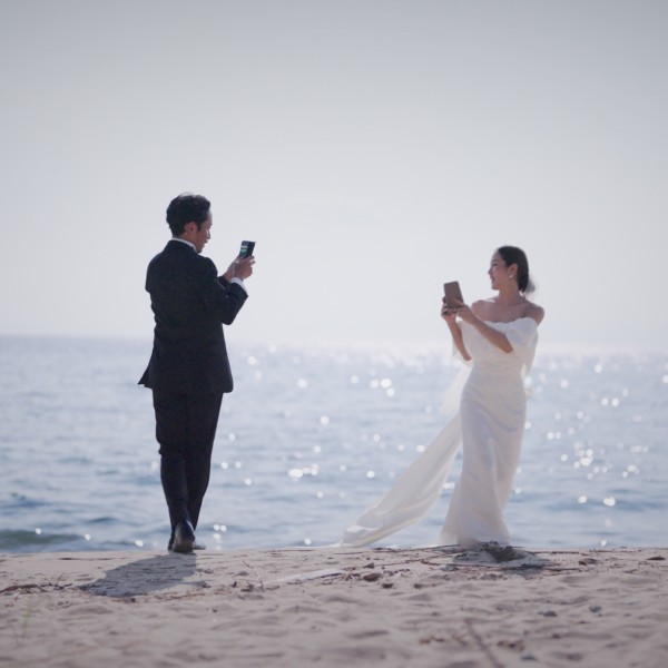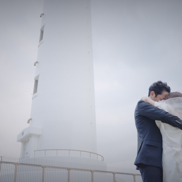 雨天延期も含め、ロケ地を変えてトータル3日間の撮影。灯台での撮影日当日、ご新郎様から連絡をもらい、ご新婦様にサプライズで花束を渡したいと。すぐさま映像チームがロケ地周辺の花屋さんを探し連絡を取り、準備してもらうことに。保存の効くドライフラワーは時間的に無理とのことだったので生花を。まだ真夏の9月。あくまでサプライズなので、撮影しながら生花を保存できるはずもなく、サプライズ直前に花屋へ取りに行く。今回はカメラマンが2人体制だったため、一人はつなぎで撮影、一人は花屋へ。そんなバタバタの前撮り撮影。しかし、このイベントが映像構成の軸となり、大成功。「真摯に頑張った先には輝かしい未来がある」。とても貴重な経験をさせて頂き、振り返ってみれば良き想い出として残っています。雨天の撮影日は思うように撮影できなかったため、打合せも兼ねて近くのファミレスへ。約5時間にも及ぶ打合せは、その半分以上はプライベートなお話…。おふたりとの距離感が縮まり、結婚式当日の撮って出しエンドロールの撮影も楽しくスムーズに行うことができました。