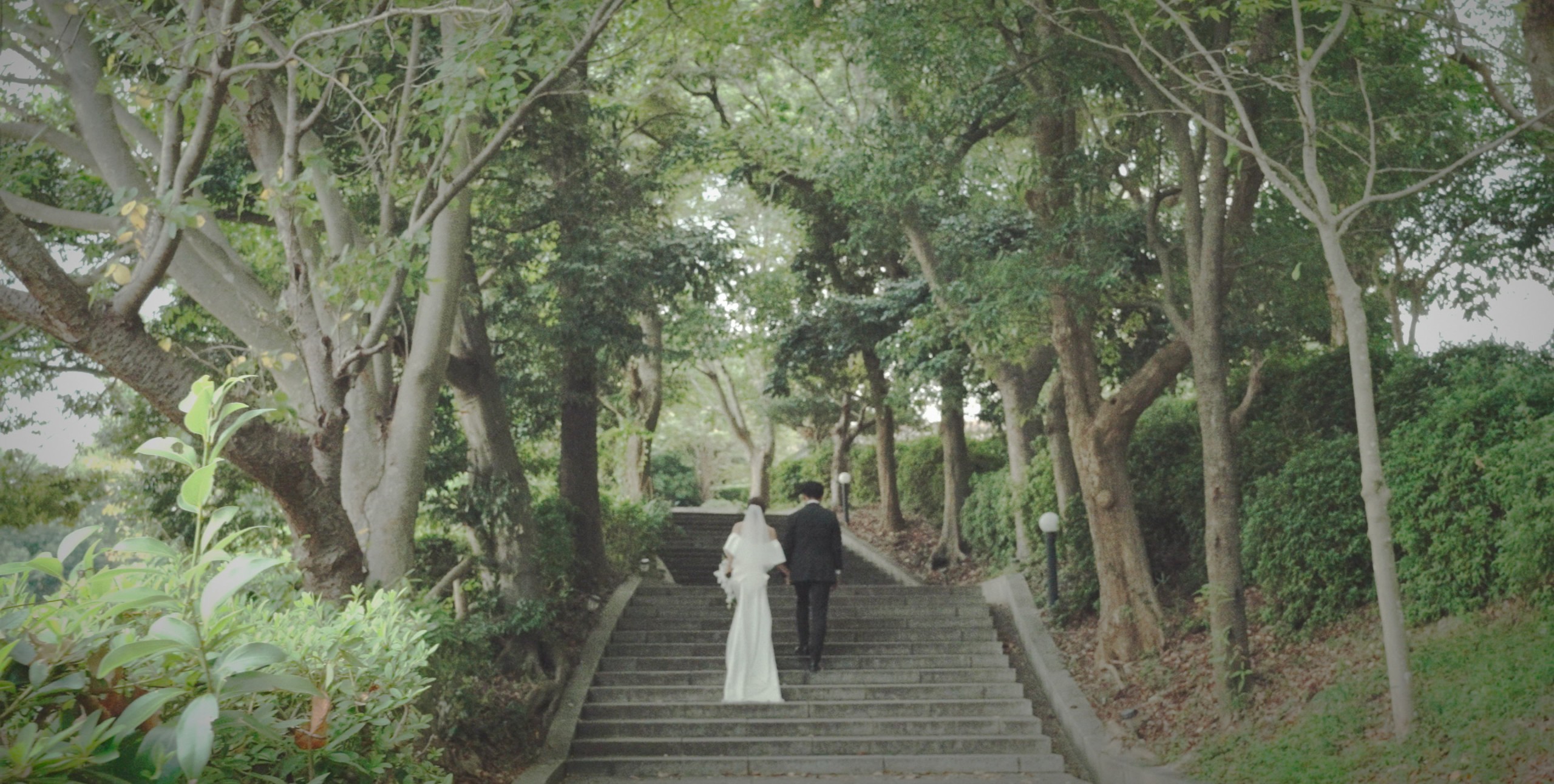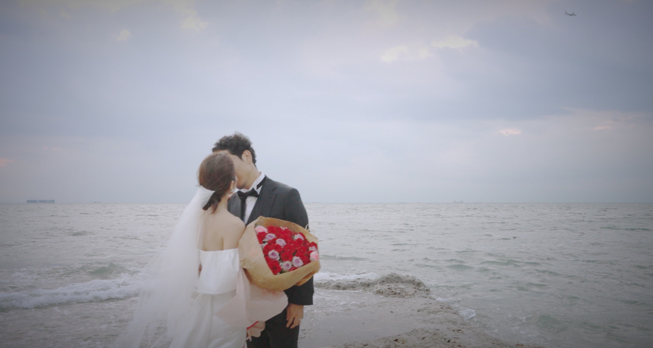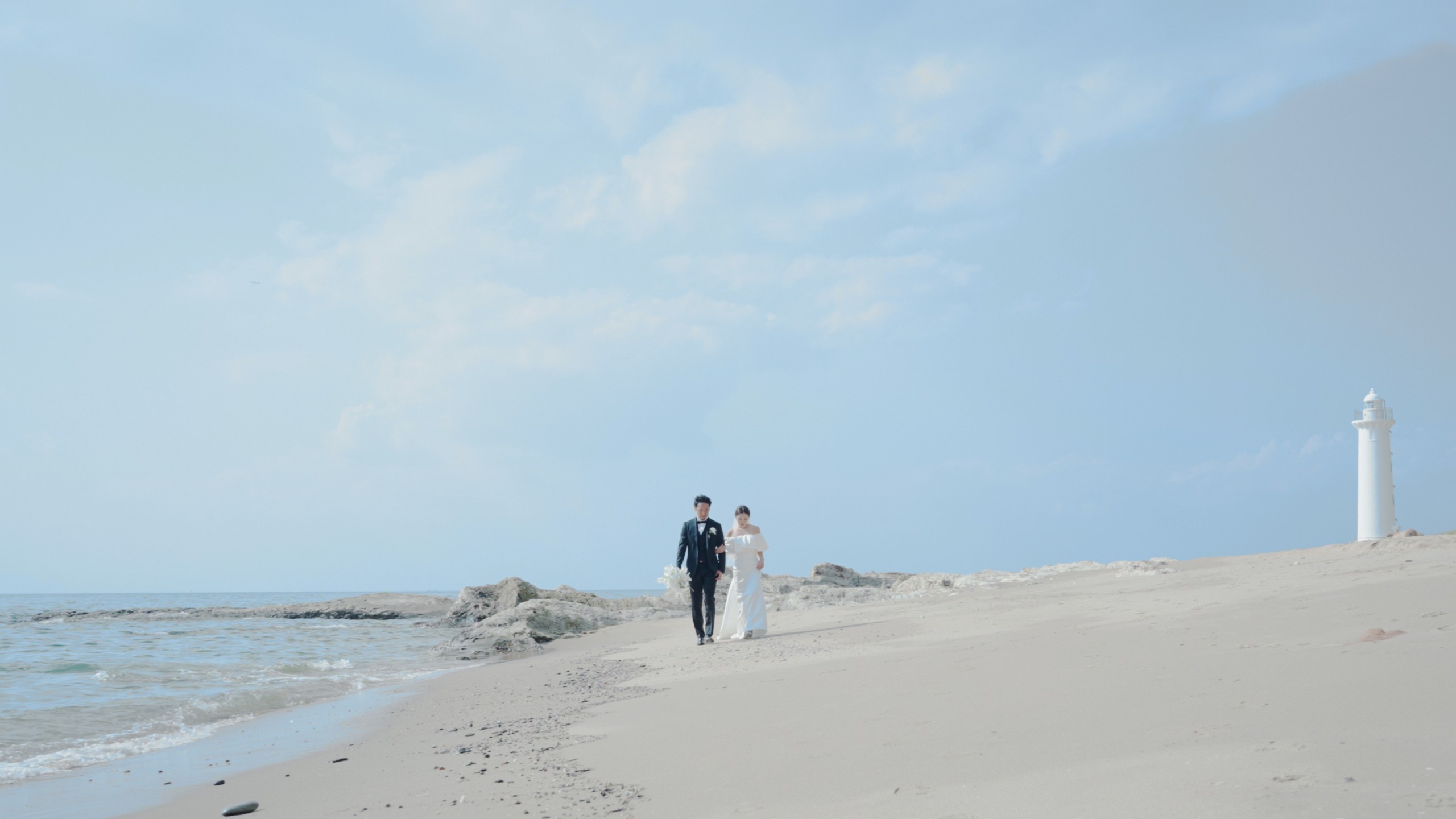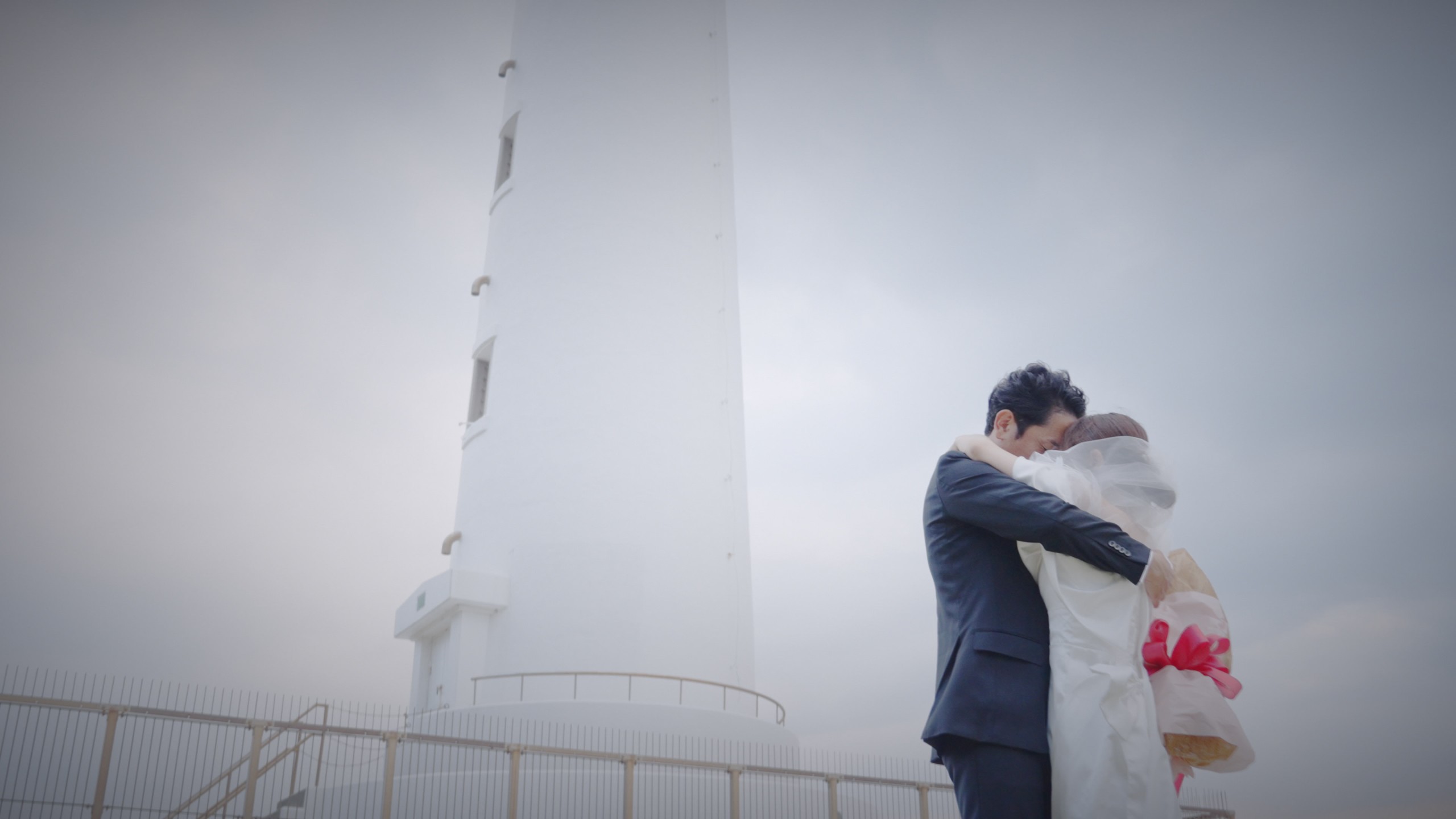 雨天延期も含め、ロケ地を変えてトータル3日間の撮影。灯台での撮影日当日、ご新郎様から連絡をもらい、ご新婦様にサプライズで花束を渡したいと。すぐさま映像チームがロケ地周辺の花屋さんを探し連絡を取り、準備してもらうことに。保存の効くドライフラワーは時間的に無理とのことだったので生花を。まだ真夏の9月。あくまでサプライズなので、撮影しながら生花を保存できるはずもなく、サプライズ直前に花屋へ取りに行く。今回はカメラマンが2人体制だったため、一人はつなぎで撮影、一人は花屋へ。そんなバタバタの前撮り撮影。しかし、このイベントが映像構成の軸となり、大成功。「真摯に頑張った先には輝かしい未来がある」。とても貴重な経験をさせて頂き、振り返ってみれば良き想い出として残っています。雨天の撮影日は思うように撮影できなかったため、打合せも兼ねて近くのファミレスへ。約5時間にも及ぶ打合せは、その半分以上はプライベートなお話…。おふたりとの距離感が縮まり、結婚式当日の撮って出しエンドロールの撮影も楽しくスムーズに行うことができました。